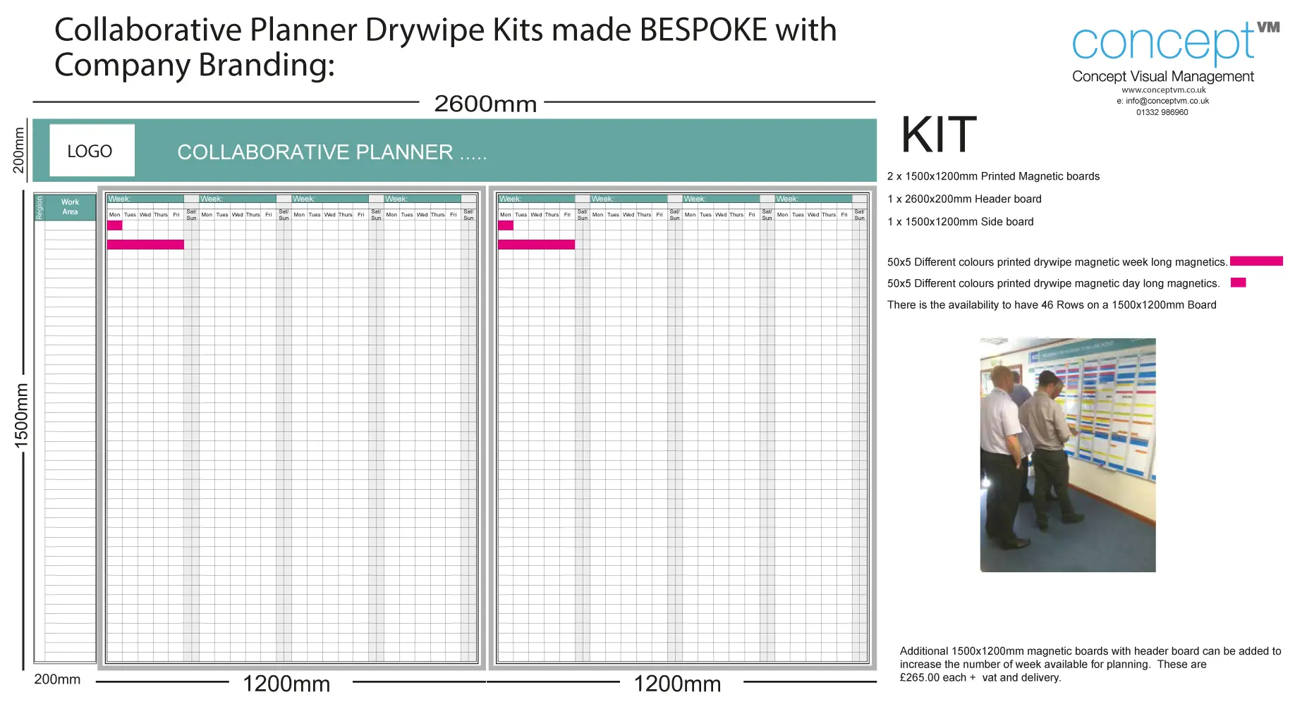 Additional 1500x1200mm magnetic boards with header board can be added to increase the number of week available for planning. These are £265 each + VAT and delivery.